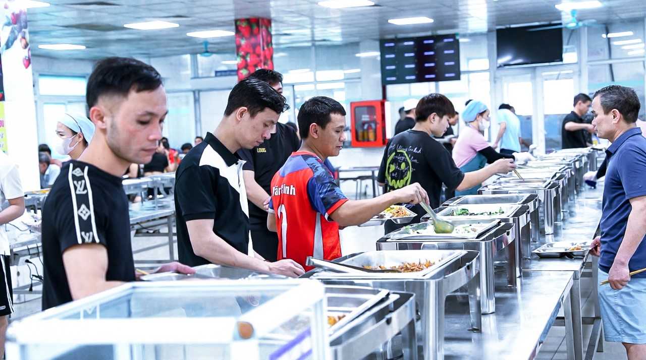 Công nhân được ăn tự chọn (buffet), đầy đủ dinh dưỡng và đảm bảo vệ sinh thực phẩm, giúp người thợ phục hồi năng lượng sau những ca sản xuất