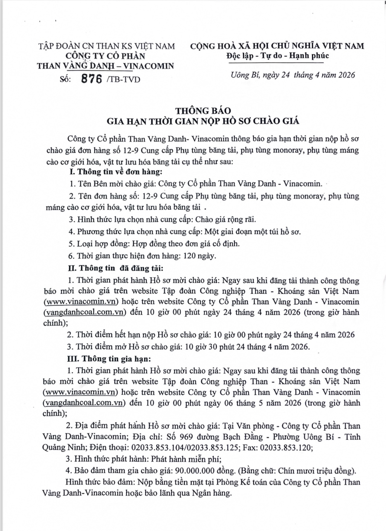 Thông báo Thông báo gia hạn Cung cấp phụ tùng băng tải, phụ tùng monoray, phụ tùng máng cào CGH, vật tư lưu hoá băng tải 24/04/2026 Screenshot Screenshot