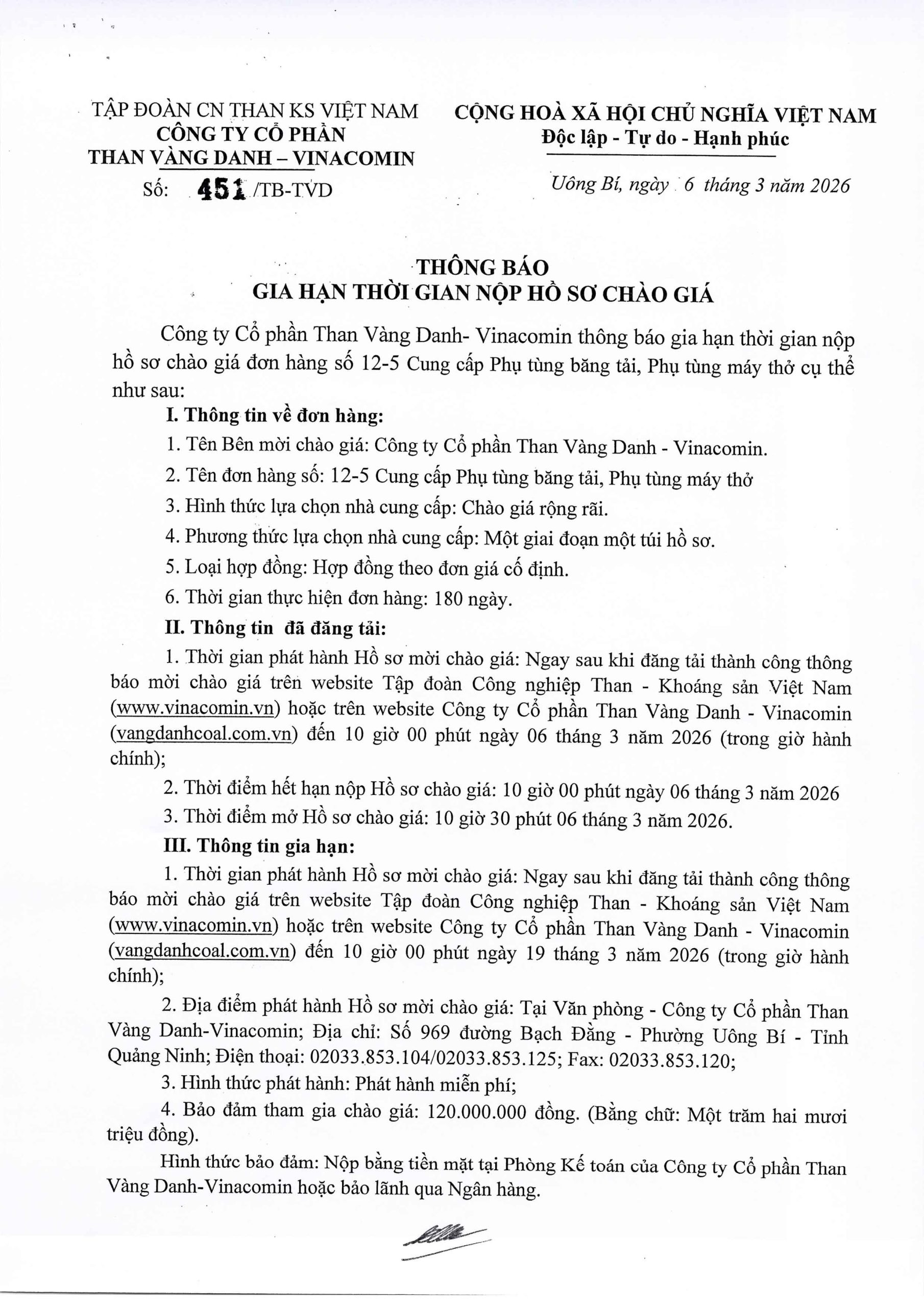 Thông báo Thông báo gia hạn nộp hồ sơ chào giá cung cấp phụ tùng băng tải, phụ tùng máy thở 06/03/2026 Scanned Image Scanned Image