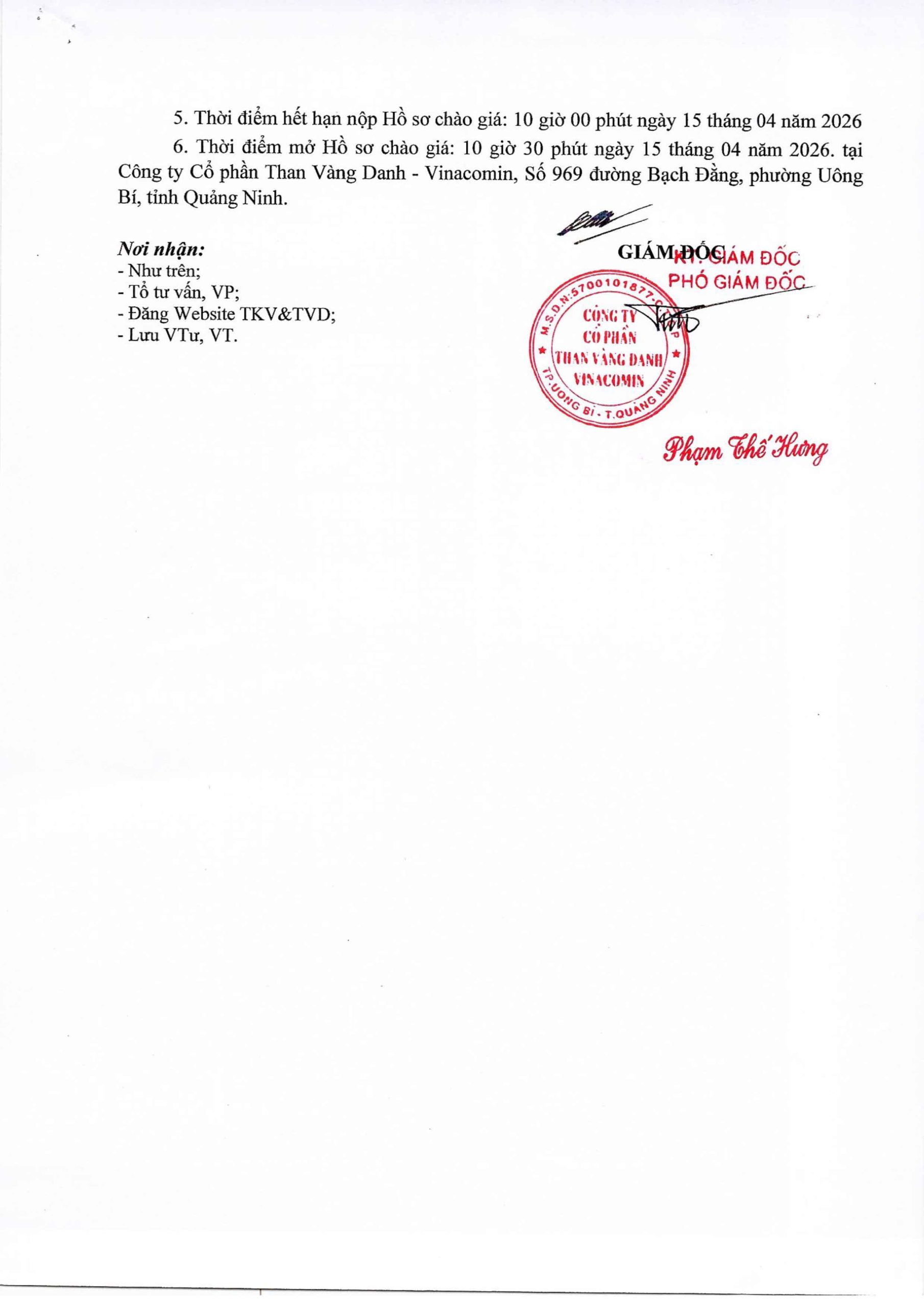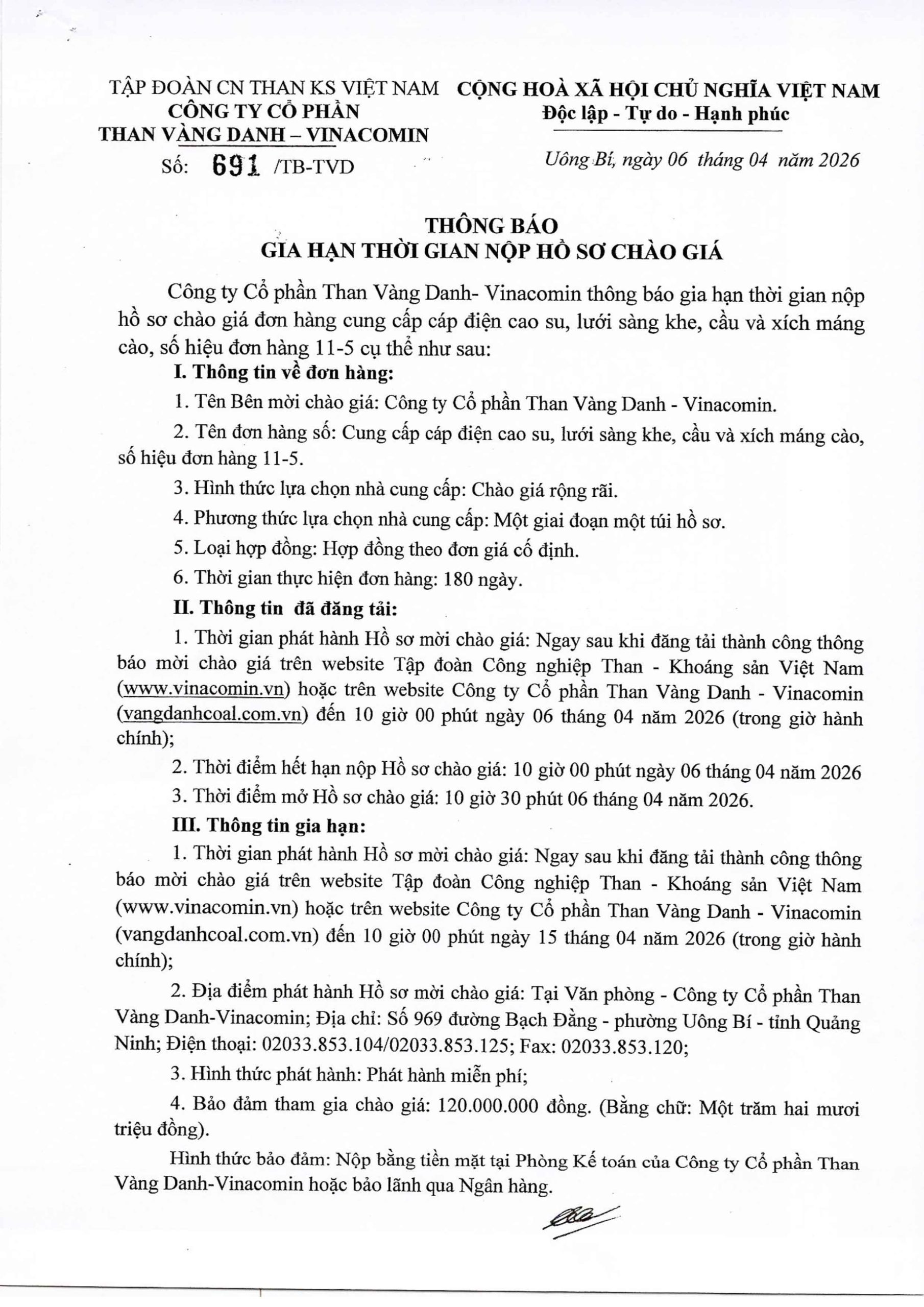 Thông báo Thông báo gia hạn nộp hồ sơ cung cấp cáp điện cao su, lưới sàng khe, cầu và xích máng cào 06/04/2026 Scanned Image Scanned Image