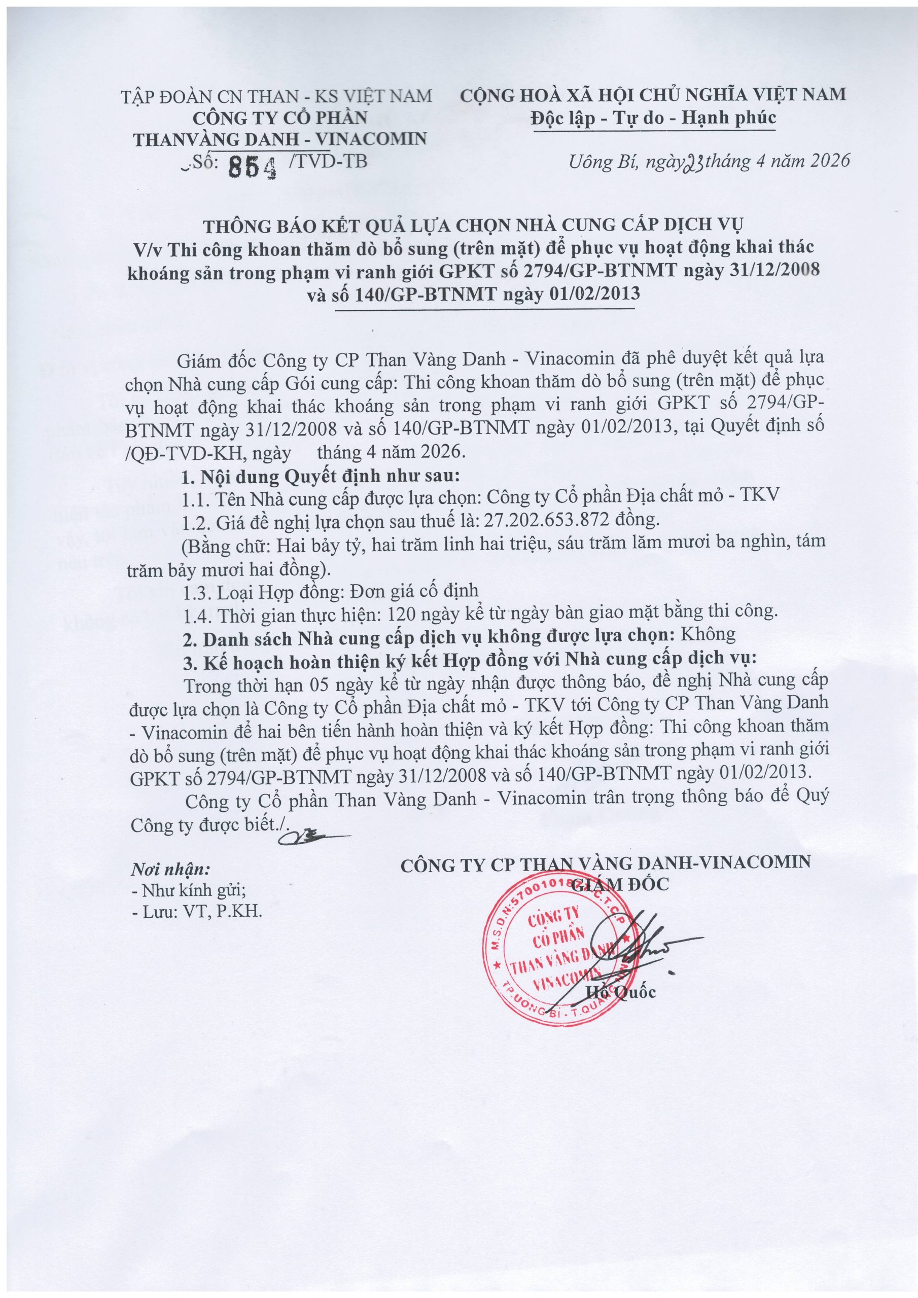 Thông báo Thông báo kết quả lựa chọn nhà cung cấp thi công khoan thăm dò bổ sung để phục vụ hoạt động khai thác khoáng sản trong phạm vi ranh giới … 23/04/2026
