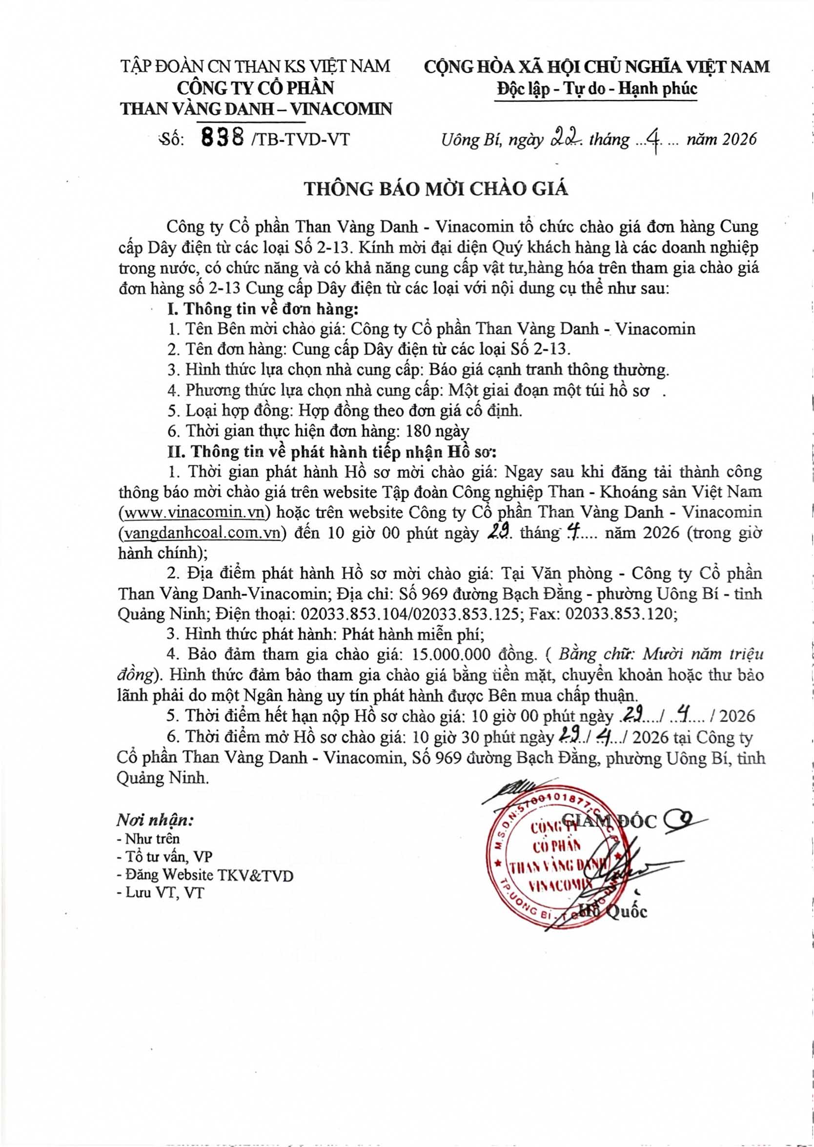 thông báo mời chào giá cung cấp dây điện từ các loại số 2-13
