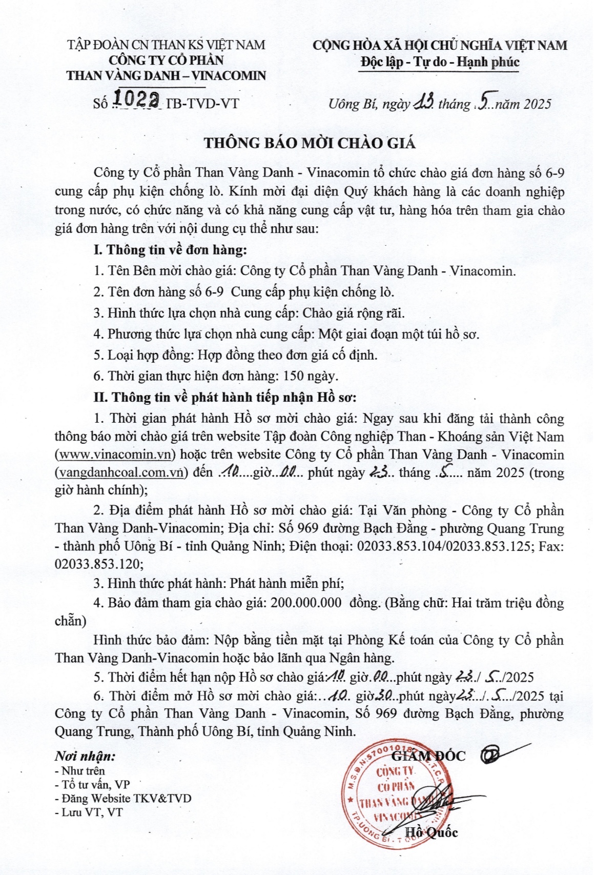 Thông báo mời chào giá cung cấp phụ kiện chống lò