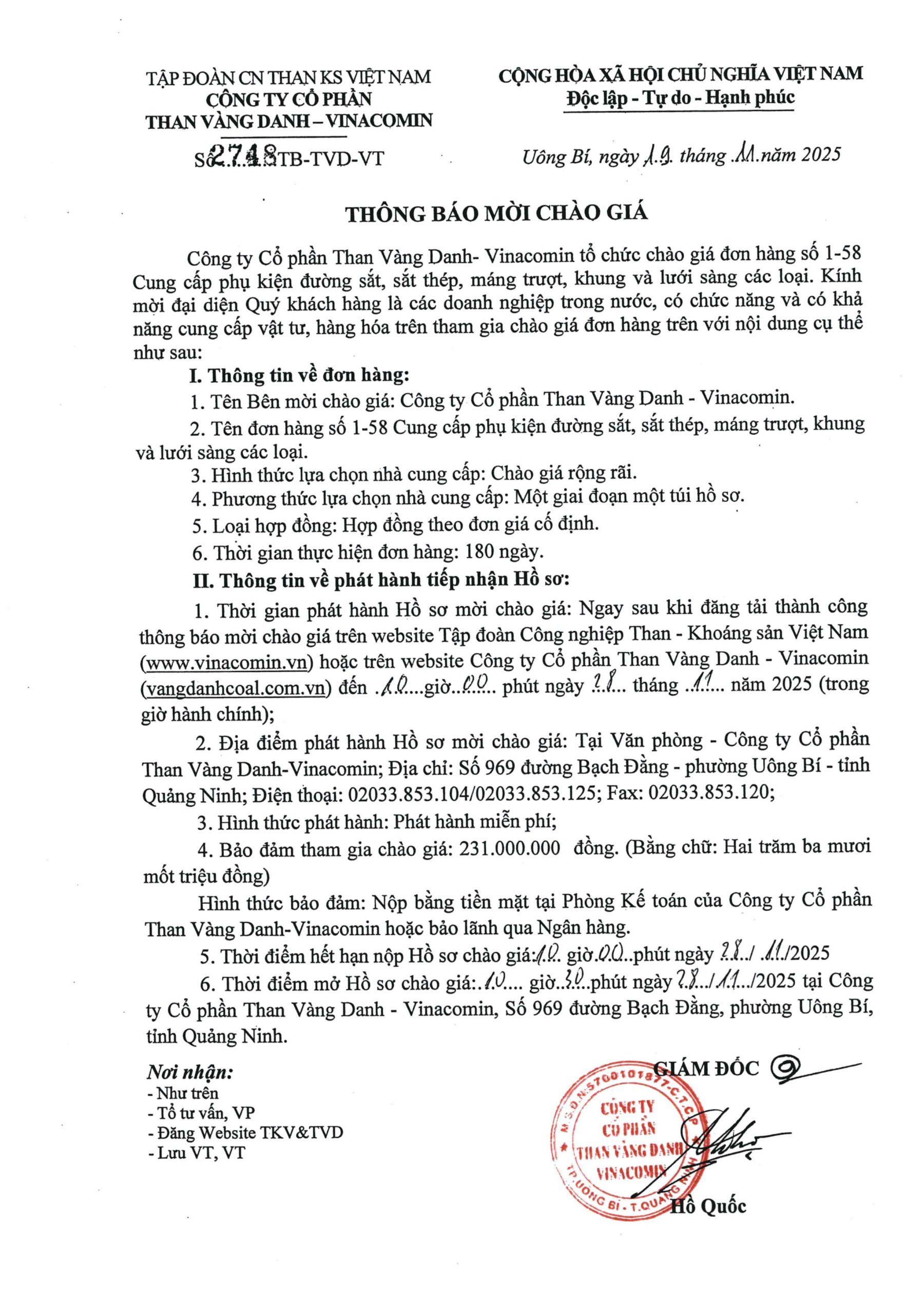 Thông báo Thông báo mời chào giá: Cung cấp phụ kiện đường sắt, sắt thép, máng trượt, khung và lưới sàng các loại 19/11/2025